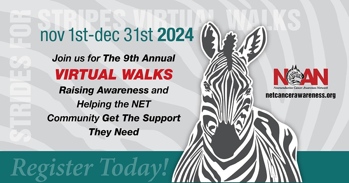 Are you ready to make a difference in the fight against neuroendocrine cancer? Then lace up your shoes and join us for NCAN's Virtual Zebra Walk...By participating in NCAN's Virtual Zebra Walk, you're joining a community of passionate individuals dedicated to raising awareness and supporting those affected by neuroendocrine cancer. Let's come together to Stride For Stripes and make a meaningful impact... REGISTER TODAY...