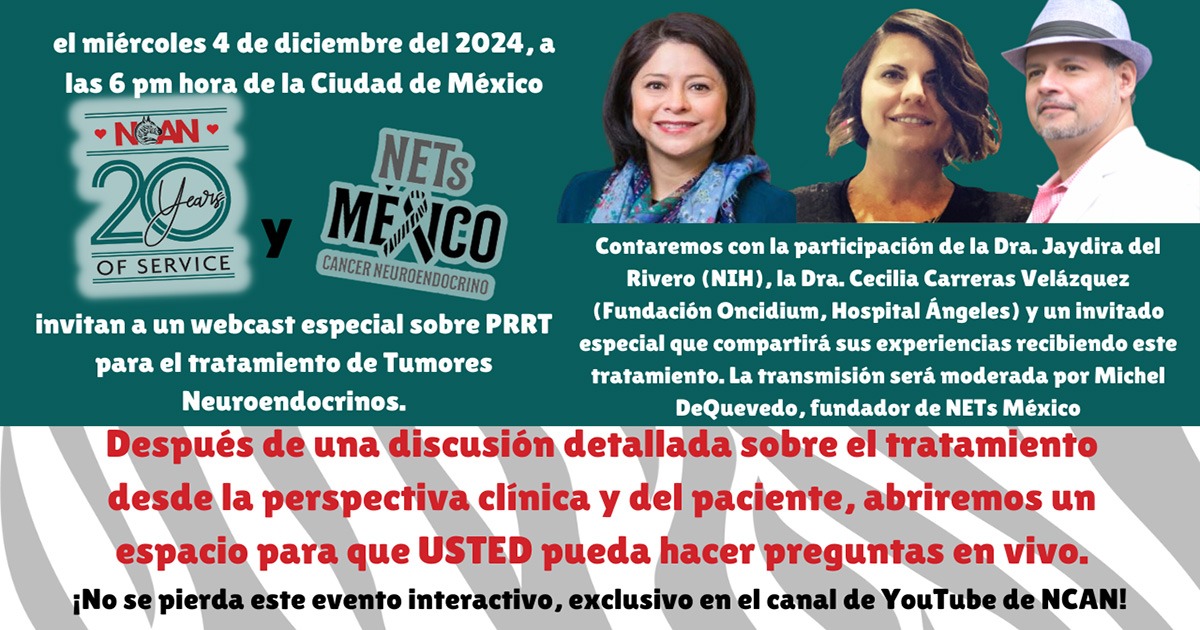 ¡NCAN y NETs México invitan a un webcast especial sobre PRRT para el tratamiento de Tumores Neuroendocrinos! Acompáñenos el miércoles 4 de diciembre del 2024, a las 6 pm hora de la Ciudad de México, en una transmisión especial en español donde hablaremos sobre el tratamiento PRRT (Lutecio 177) para pacientes con NETs. Contaremos con la participación de la Dra. Jaydira del Rivero (NIH), la Dra. Cecilia Carreras Velázquez (Fundación Oncidium, Hospital Ángeles) y un invitado especial que compartirá sus experiencias recibiendo este tratamiento. La transmisión será moderada por Michel DeQuevedo, fundador de NETs México. Después de una discusión detallada sobre el tratamiento desde la perspectiva clínica y del paciente, abriremos un espacio para que USTED pueda hacer preguntas en vivo. ¡No se pierda este evento interactivo, exclusivo en el canal de YouTube de NCAN! Join us for a Special Roundtable about Nuclear Medicine in NETs! Join us on Wednesday, December 4th, 2024 for a special Spanish Speaking roundtable covering Nuclear Medicine in NETs featuring Dr. Jaydi del Rivero, Dr. Cecilia Carreras Velázquez and a PRRT treated patient and hosted by NETs Mexico founder, Michel DeQuevedo! After an in-depth discussion about Nuclear Medicine's role in NET treatment from both the clinical and patient perspectives, we open the floor to YOU for live questions. Don't miss this incredible live and interactive event exclusively on NCAN's YouTube Channel at the link below! www.youtube.com/@neuroendocrinecancerawaren6842