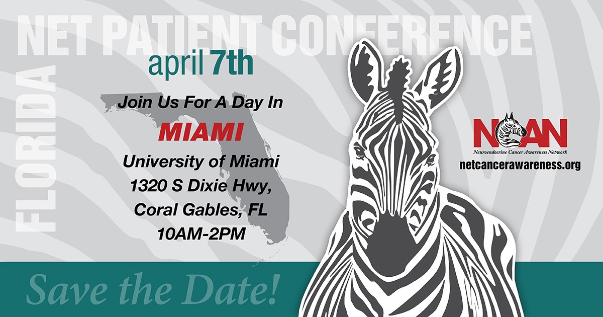 NCAN 2024 Miami NET Patient Conference – Coral Gables, FL   REGISTER TODAY! April 7th, 2024.   Please join us Sunday, April 7th for the not-to-be-missed, in-person NCAN 2024 Miami NET Patient Conference in Coral Gables, FL.   • ADVICE FROM EXPERT NET DOCTORS • INFORMATION FOR PATIENTS, CAREGIVERS, FAMILY MEMBERS, AND ADVOCATES • COVID-19 SAFETY PROTOCOLS • THE LATEST ON RESEARCH AND TREATMENTS • BUILD YOUR NETS KNOWLEDGE • LEARN TO BE YOUR OWN BEST ADVOCATE • HAVE FUN CONNECTING WITH OTHER ZEBRAS